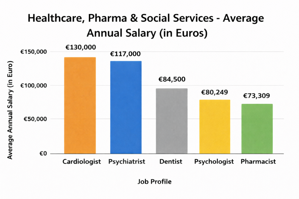 - Healthcare, Pharmaceutical & Social Services (avg annual salary: €58,959)