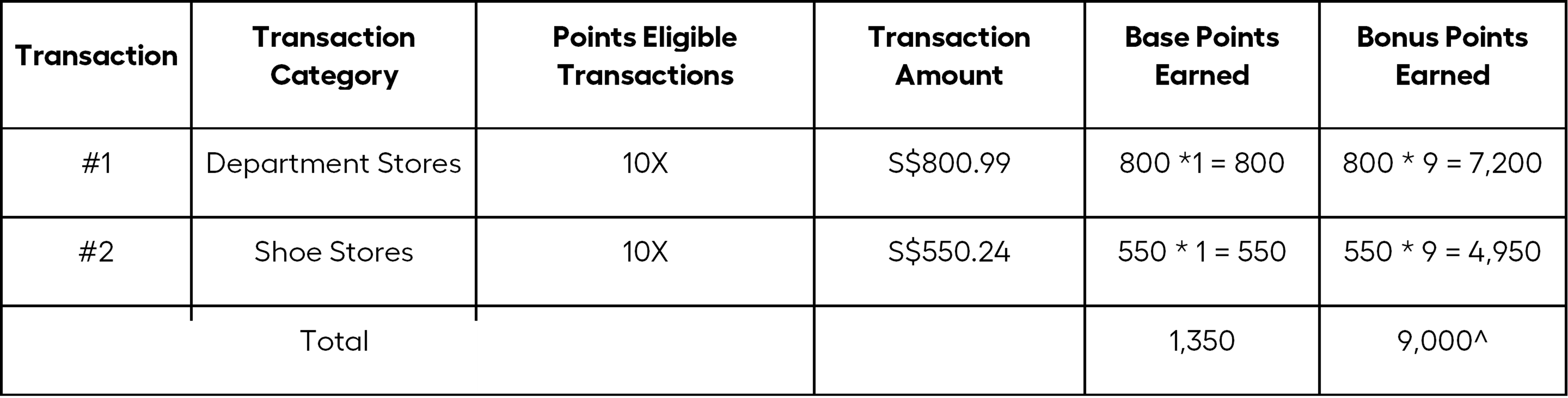 - 9 Bonus Points for every S$1 of a 10X Points Eligible Transaction