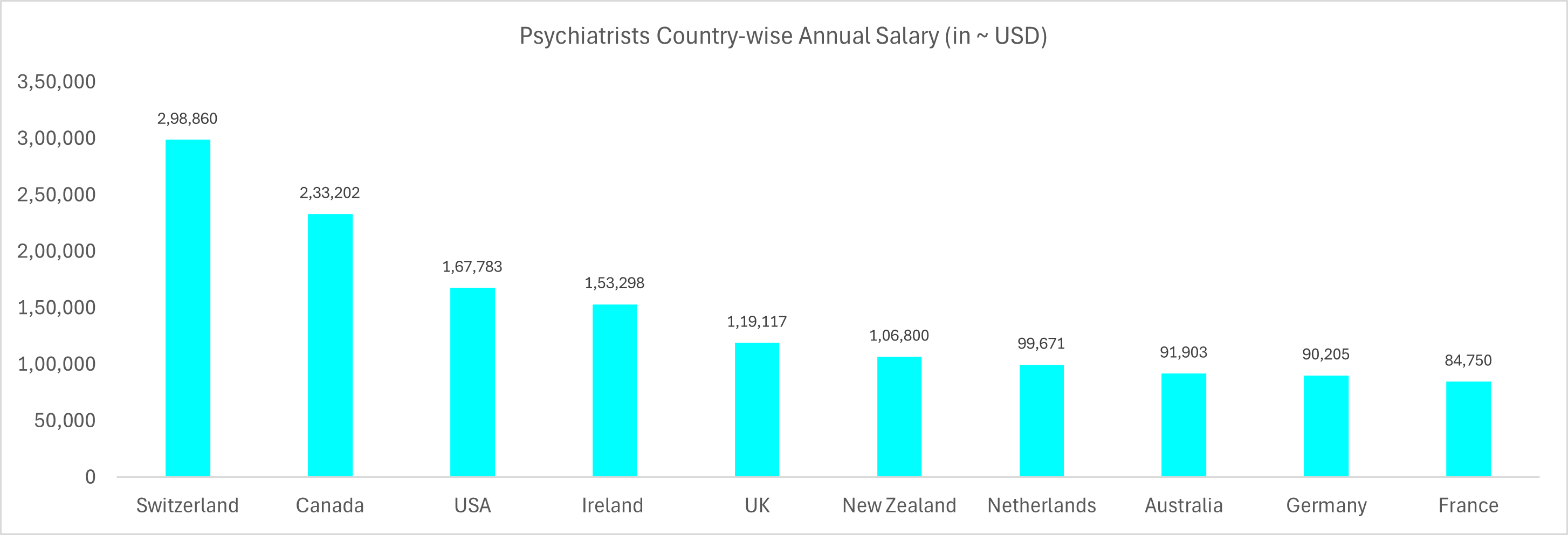 The United States of America offers the highest annual average salary for psychiatrists, which ranges around USD 167,783.